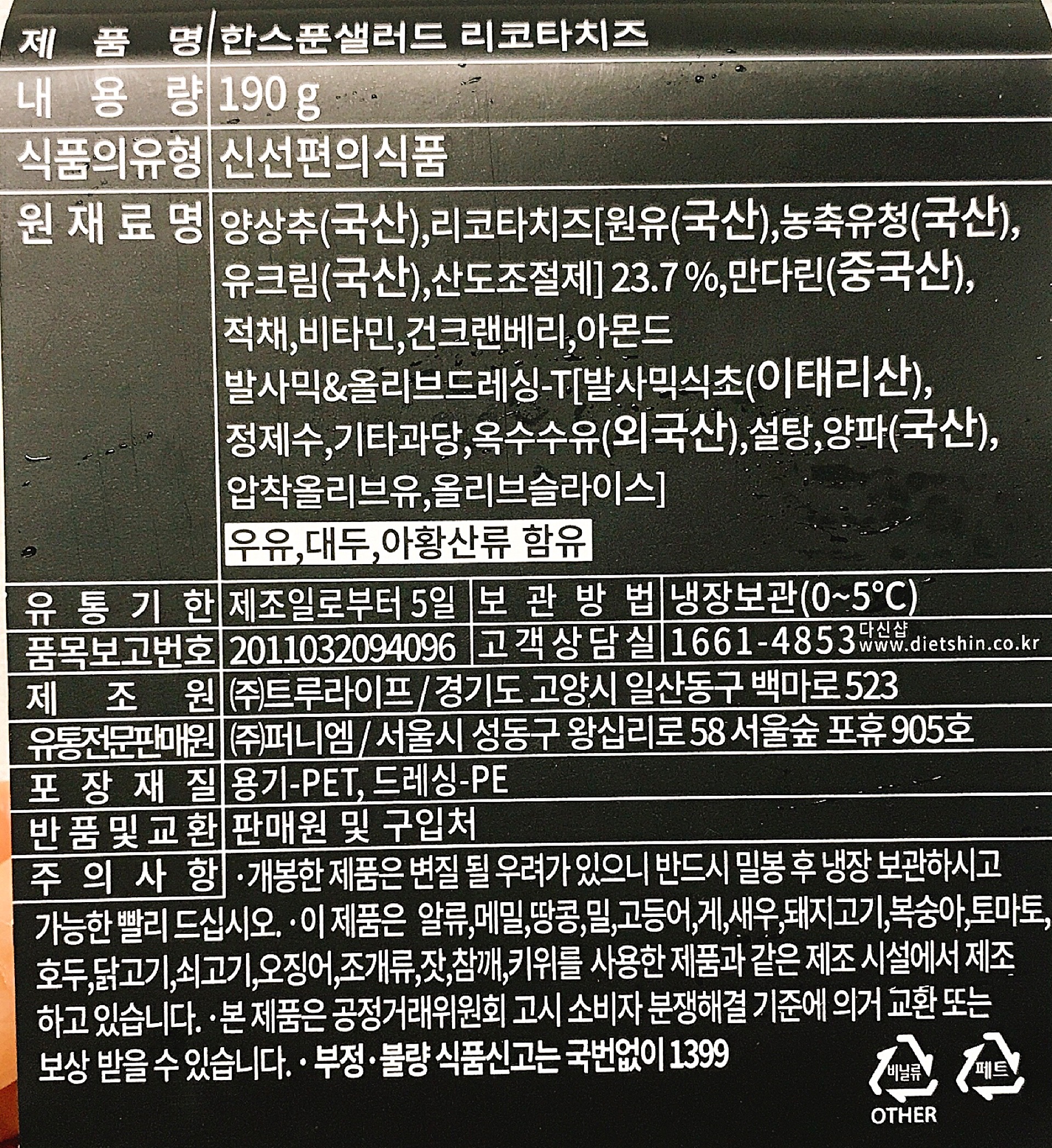 난 행사가로 종류별 패키지 구성으로 6종류에 23,000원으로 구입해서, 개당 4천원이 채 안되는 가격인 셈이니 요즘 시중에 판매하는 샐러드 가격을 생각하면 가성비 면에서 좋다.